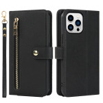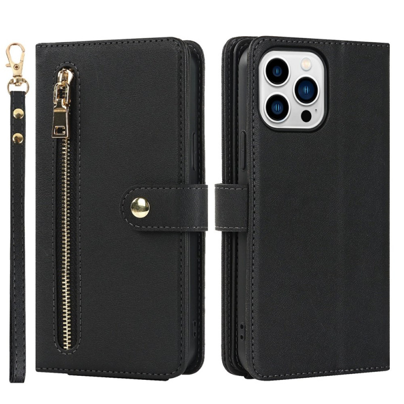 Étui portefeuille multifonction en cuir PU pour iPhone 14 Pro Max. Design tout-en-un avec multiples fentes pour cartes, poche zippée et compartiment pour espèces. Livré avec deux bandoulières détachables (poignet et épaule ajustable). Fonction support intégrée pour visionnage mains libres et fermeture magnétique sécurisée.