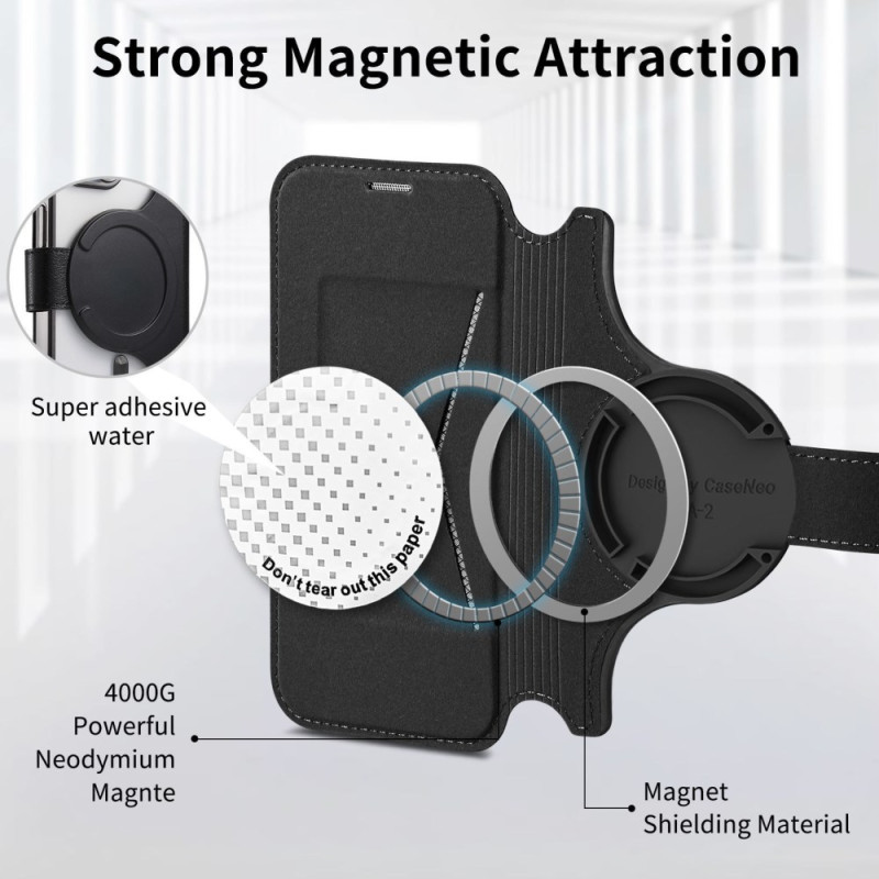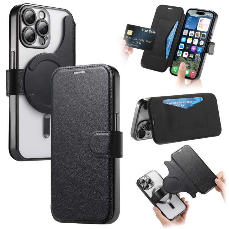 Elegante cover in pelle PU con cover in TPU trasparente per una protezione completa. Compatibile con MagSafe grazie al potente magnete, al supporto regolabile integrato e al portacarte con tecnologia RFID per mantenere al sicuro le tue informazioni.