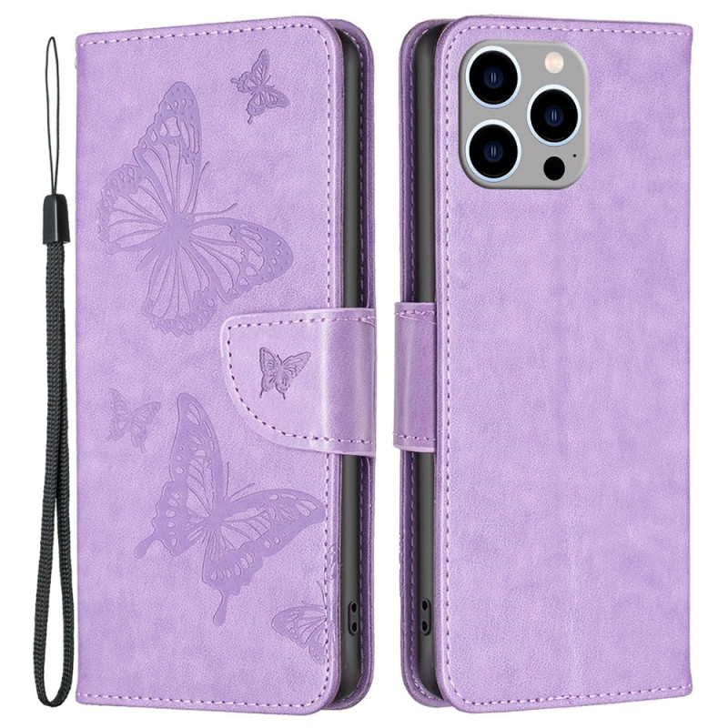 La cover in similpelle stampata a farfalla è dotata di un comodo laccetto per il trasporto dell'iPhone 14 Pro Max.