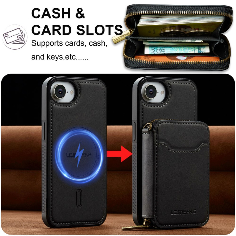 Custodia 2-in-1 staccabile con portafoglio a zip magnetica, compatibile con MagSafe. Conserva in modo sicuro fino a 10 carte, contanti e chiavi. Protezione ibrida in pelle PU, PC e TPU con tecnologia anti-RFID integrata per una sicurezza ottimale.