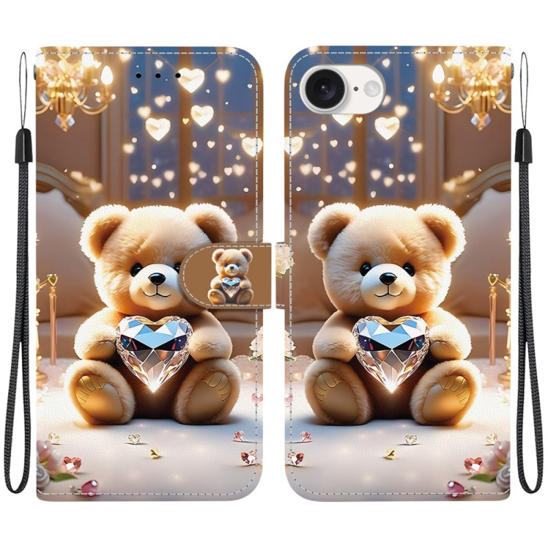 Elegante cover a portafoglio con motivo a orsetto diamantato per iPhone 17E / 16E. Design raffinato con supporto pieghevole integrato, 2 slot per carte e scomparto per contanti. Chiusura magnetica sicura e cinturino rimovibile per un facile trasporto...