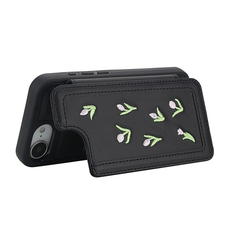 Scoprite questa elegante cover in pelle PU con ricamo floreale artigianale per iPhone 17e / 16e. Unisce stile e praticità grazie al portacarte magnetico integrato, alla funzione stand e ai due cinturini rimovibili da indossare sul corpo o al polso.