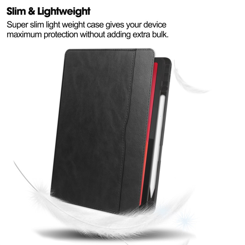Proteggete il tuo tablet con stile grazie a questa cover multifunzione in pregiata pelle PU. È dotata di un pratico supporto pieghevole, di slot per carte, di un portapenne e di una funzione di sveglia automatica per risparmiare la batteria.