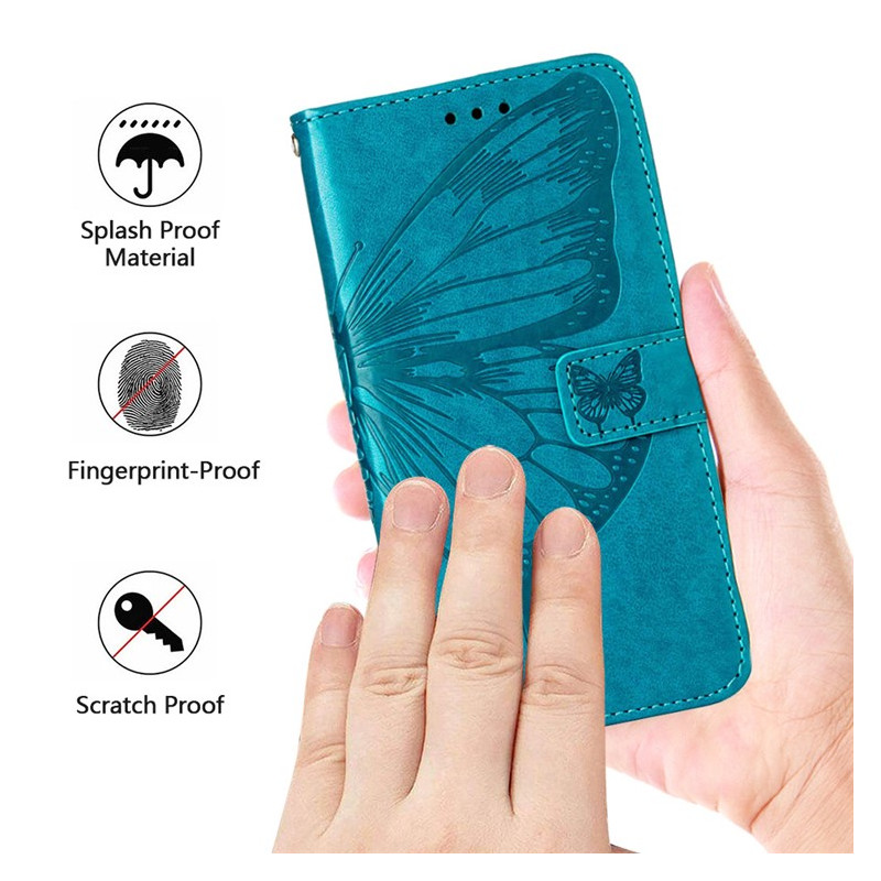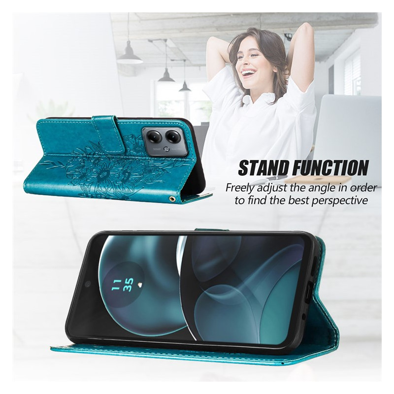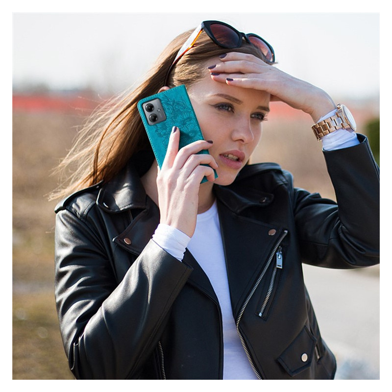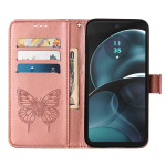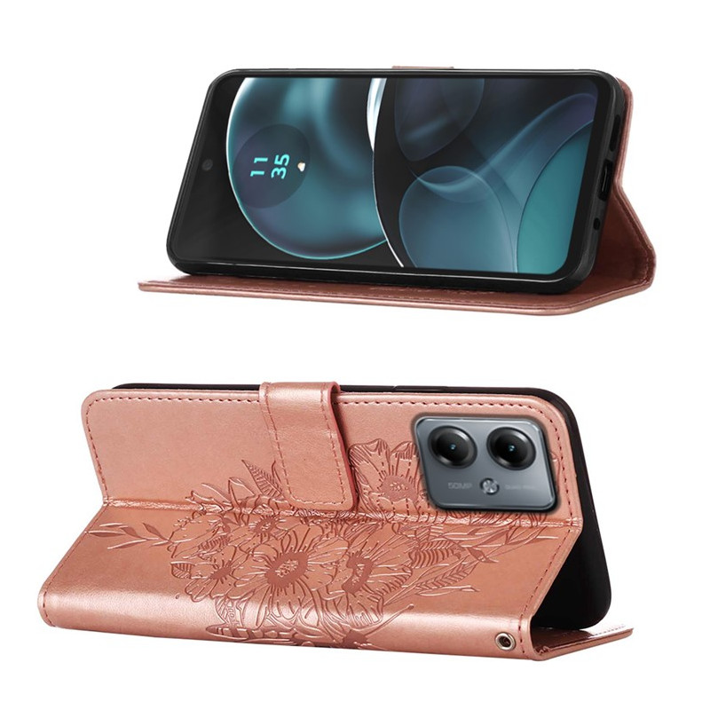 Una cover portafoglio elegante e funzionale con farfalla barocca e cinturino progettata per il Motorola Moto G14 4G.