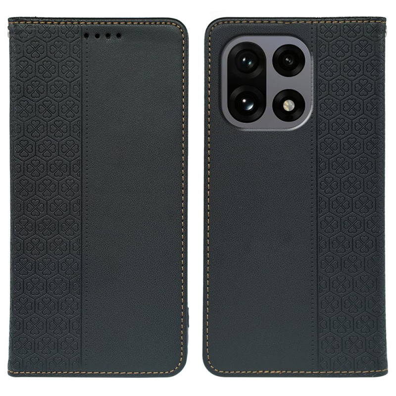 con patta per il OnePlus 15 5G. Realizzata in pregiata pelle PU con motivo a quadrifoglio, unisce stile e funzionalità. Dispone di 3 scomparti per carte, una tasca per il denaro e un supporto regolabile.