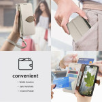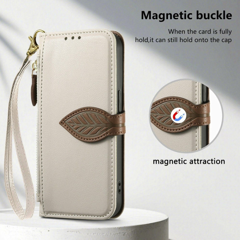 Elegante cover in pelle PU con chiusura magnetica a foglia per Oppo A6 Pro 5G / 4G. Dispone di 3 scomparti per carte, 1 tasca per contanti e una tasca esterna con zip. Supporto integrato per la visualizzazione mani libere e cinturino staccabile.