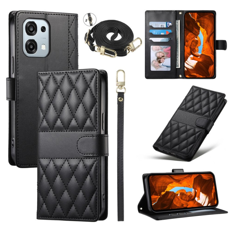 Sofisticato portafoglio in pelle PU con design trapuntato a rombi. Presenta 3 scomparti per carte, 1 tasca per contanti, funzione stand integrata e chiusura magnetica sicura. È dotato di cinghia a mano staccabile e tracolla regolabile per la massima praticità quotidiana.