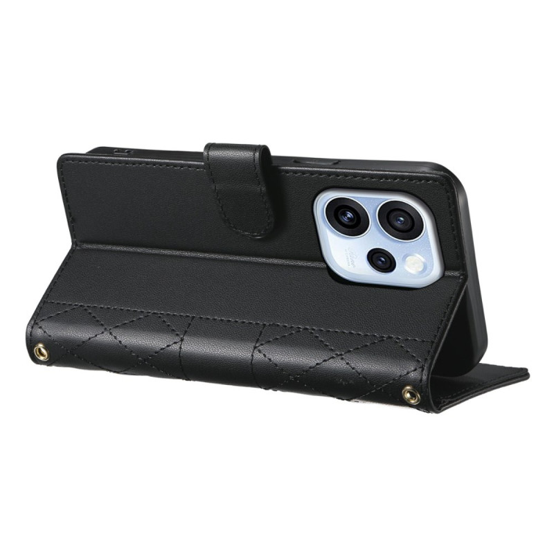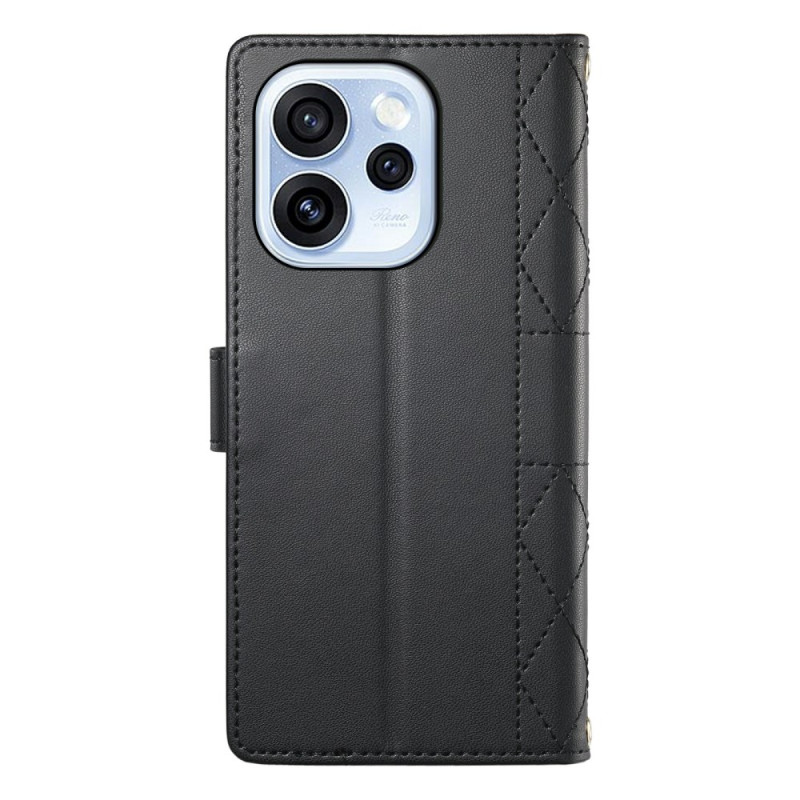 Elegante cover a portafoglio in pelle PU con design trapuntato a diamante per Oppo Reno 15 F 5G. Dispone di 3 scomparti per carte, 1 tasca per contanti, funzione stand integrata, polso staccabile e spallacci regolabili (70-150 cm).