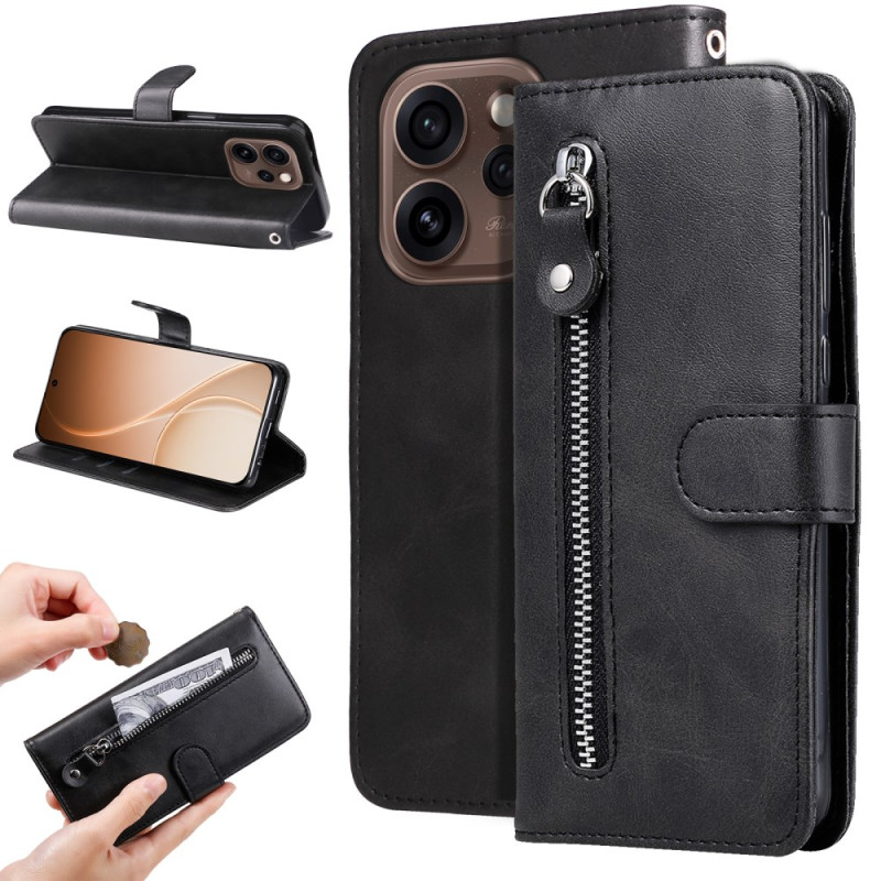 Custodia multifunzione per Oppo Reno 15 Pro 5G. Combina eleganza e praticità grazie agli scomparti multipli per le carte, alla tasca sicura con cerniera per i piccoli oggetti e alla funzione di supporto per la visione a mani libere. Protezione completa a 360° contro urti e graffi.