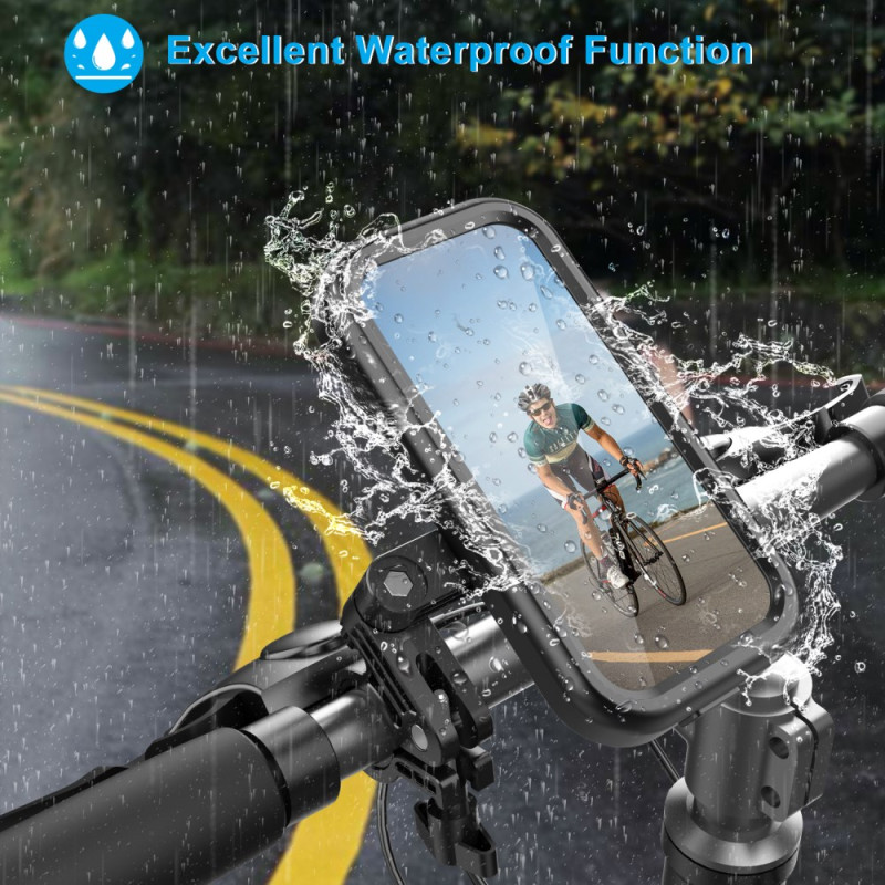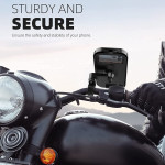 Grazie al suo design completamente impermeabile, la navigazione continua è ora garantita anche sotto gli acquazzoni più intensi. Questo supporto è stato appositamente progettato per essere fissato saldamente allo specchietto retrovisore (apertura di 10 mm) della tua moto o bici elettrica. L'involucro in ABS e fibra di nylon protegge il telefono (da 4,7 a 6,8 pollici) da acqua, sabbia e polvere. I cuscinetti in silicone e la spugna interna assorbono gli urti e le vibrazioni. Lo snodo sferico consente una rotazione di 360° per ottenere angoli di visione ottimali, mentre l'accesso completo al touch screen garantisce la facilità d'uso.