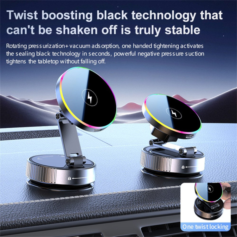 Supporto magnetico per caricabatterie wireless da auto con rotazione panoramica a 360°, ricarica rapida a 15W e potente ventosa. Compatibile con iPhone 12-17 e Android. Facile installazione, fissaggio sicuro e struttura resistente per gli spostamenti.