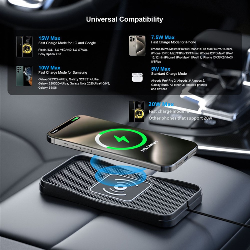 Caricatore wireless per auto che offre una ricarica rapida fino a 20W. È dotato di un cuscinetto in silicone antiscivolo per tenere il telefono al sicuro durante la guida. Facile da installare senza modificare il veicolo, con cavo da 1 metro.