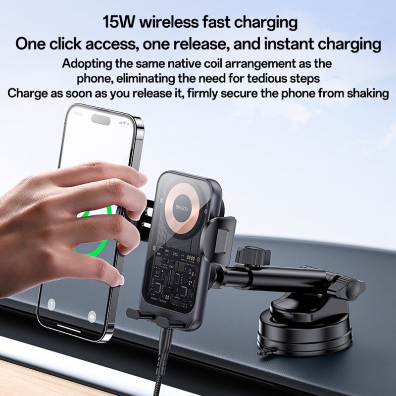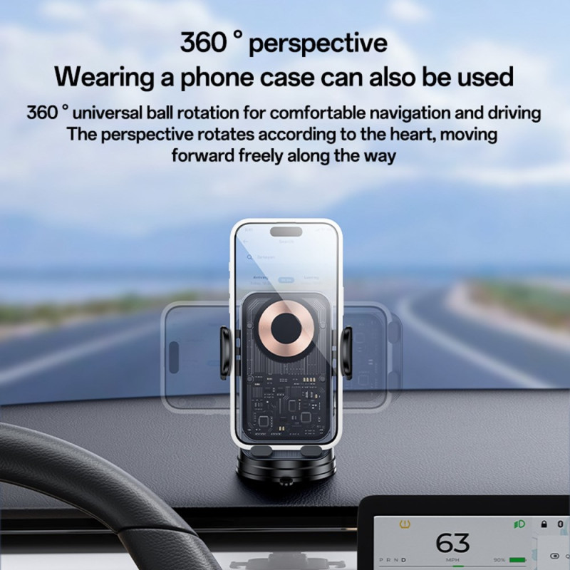 Trasformate il tuo viaggio con questo supporto per smartphone con ricarica wireless da 15W. Dotato di un comodo morsetto automatico, di una ventosa rotante a 360° e di forti magneti per un fissaggio sicuro. Compatibile con tutti i dispositivi Qi per una ricarica rapida durante la guida.