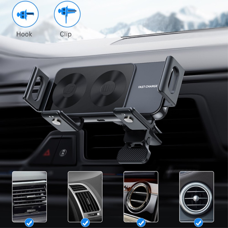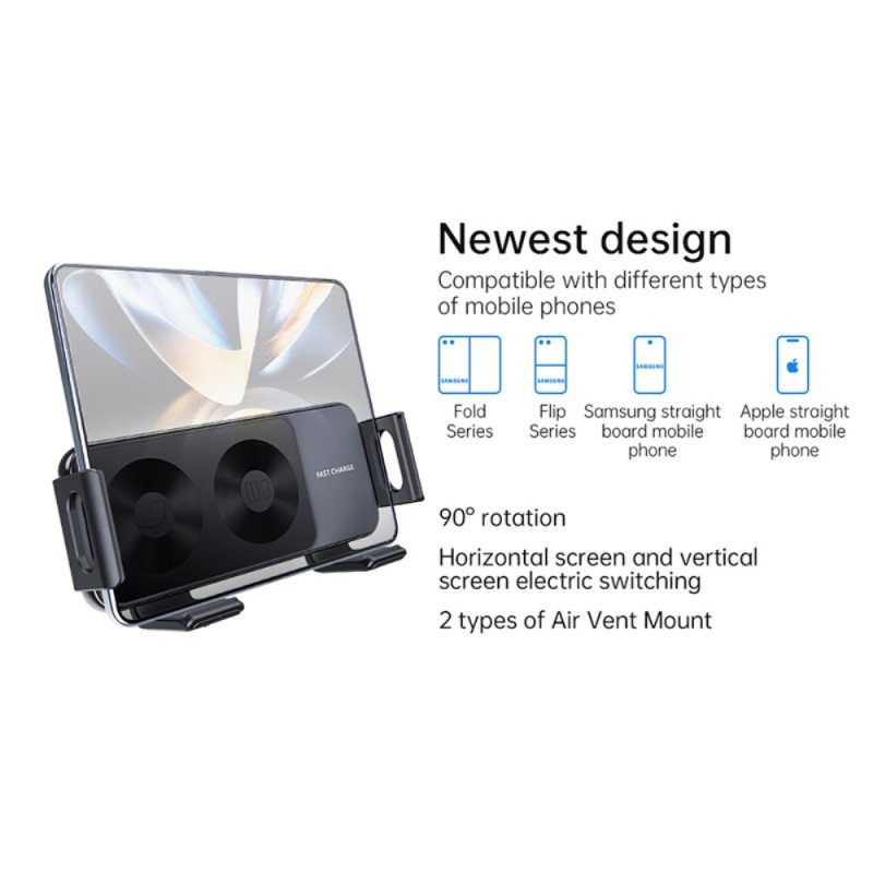 Supporto per auto con caricatore wireless smart appositamente progettato per gli smartphone pieghevoli Samsung. Rotazione automatica di 90 gradi e doppia bobina per una ricarica ottimale in posizione orizzontale o verticale.
