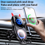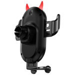 Caricabatterie wireless veloce da 15W con supporto per bocchetta d'aria dal design Devil. Compatibile con tutti i dispositivi Qi (iPhone, Samsung, Huawei). Tecnologia magnetica per un aggancio immediato e illuminazione d'atmosfera integrata.