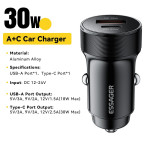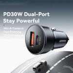 Caricabatterie da auto ESSAGER con tecnologia PD 30W per una ricarica ultraveloce. Doppia porta USB-A e Tipo-C con chip smart per una distribuzione ottimale della potenza. Compatibile con tutti i dispositivi.