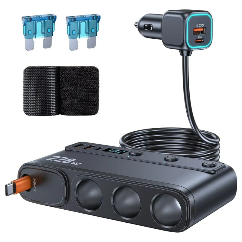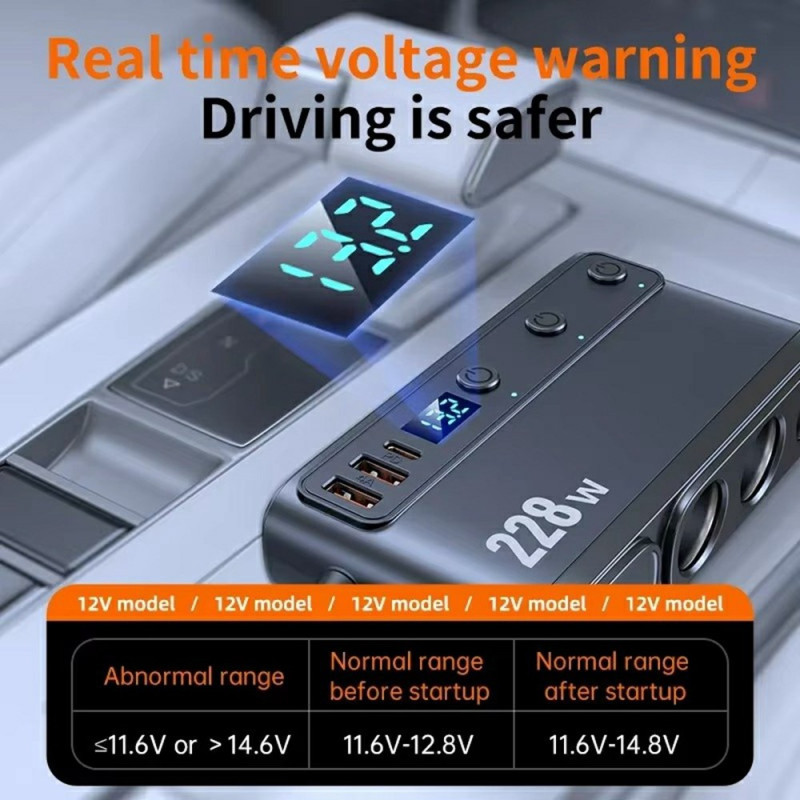 Caricabatterie da auto multifunzione 9 in 1 da 228 W con porte accendisigari, PD e USB. Display digitale che mostra la tensione della batteria per una guida sicura. Clip antiscivolo per una presa stabile. Compatibile con i protocolli di ricarica rapida Apple PD, QC3.0, Samsung AFC e Huawei FCP...