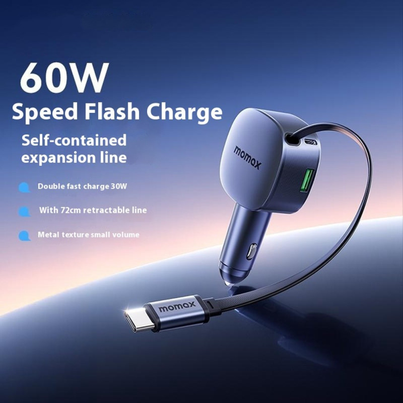 Caricabatterie da auto da 60 W con cavo retrattile integrato da 72 cm. Ricarica rapida simultanea per un massimo di 3 dispositivi (smartphone, tablet, laptop). Compatibile con PD/QC/PPS e con il 90% dei veicoli da 12-24V. Protezione smart contro le sovratensioni.