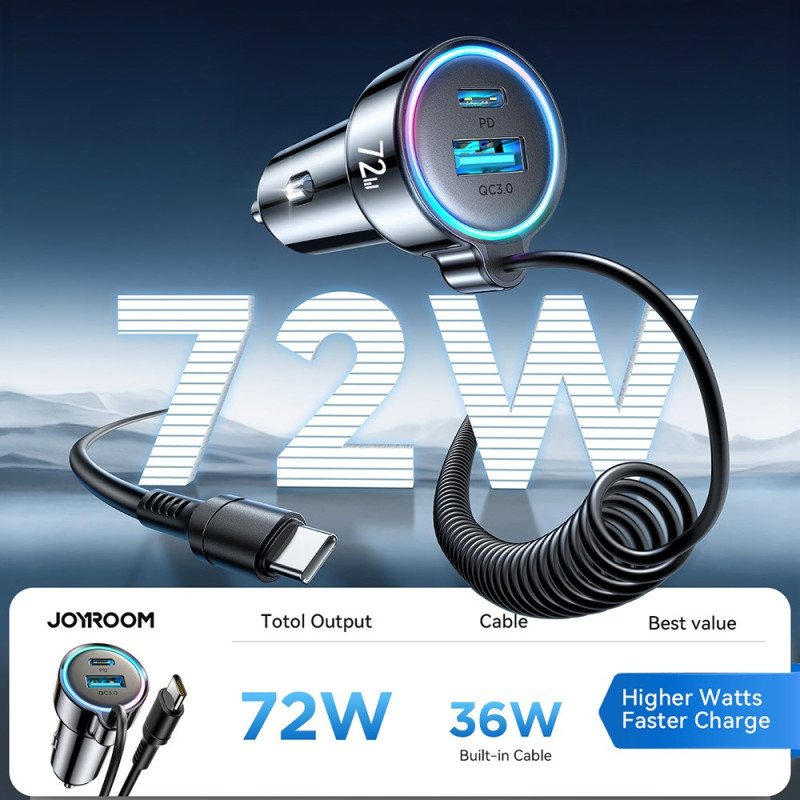 Caricate fino a tre dispositivi contemporaneamente con il nostro caricabatterie per auto ultraveloce da 72W. Con un cavo a molla che può essere allungato fino a 1,6 m e un'illuminazione ambientale a 7 colori, offre una ricarica sicura e comoda per tutti i tuoi dispositivi.