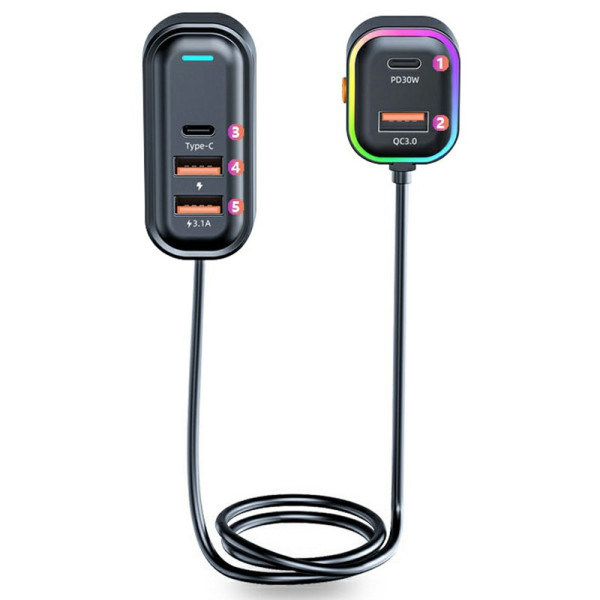 Trasforma la tua auto in una stazione di ricarica versatile! Questo caricatore multiplo offre una ricarica veloce da 30W PD e QC 3.0 per tutti i tuoi dispositivi. Grazie al cavo di prolunga da 1 m e all'elegante illuminazione d'atmosfera, è possibile caricare fino a 5 dispositivi contemporaneamente dai sedili anteriori e posteriori.