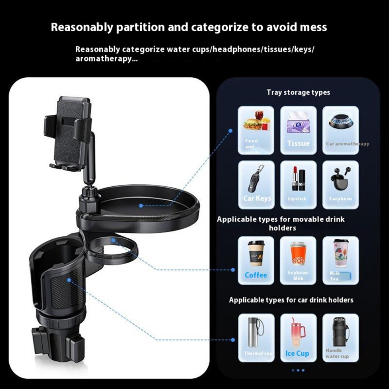 Trasforma il tuo portabicchieri in una stazione multifunzione! Questo supporto universale 4 in 1 combina un portacellulare rotante a 360°, un vassoio portaoggetti e un doppio portabicchieri. Facile da installare con una semplice rotazione, è compatibile con la maggior parte dei veicoli.