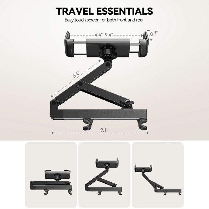 Innovativo supporto per poggiatesta con struttura estensibile a doppio asse per una stabilità eccezionale. Design regolabile e pieghevole con sistema di bloccaggio sicuro. Installazione rapida grazie alla struttura a doppia molla. Regolazione multiangolo per un comfort di visione ottimale. Compatibile con dispositivi da 4,7 a 13 pollici e con interasse dei poggiatesta da 70 a 158 mm.