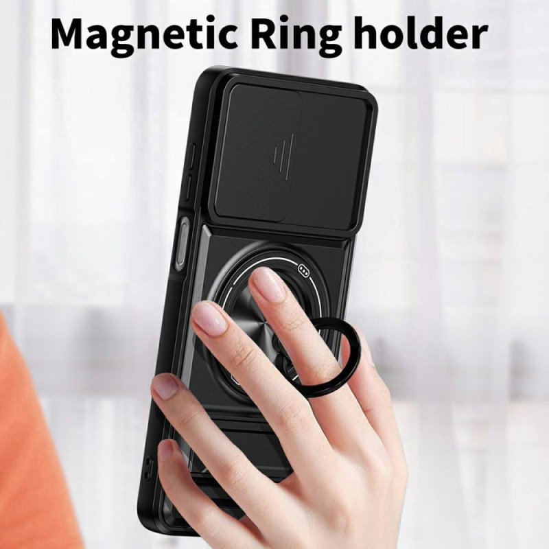 Proteggete il tuo Samsung Galaxy A07 5G / 4G con questa innovativa cover magnetica. Dotata di un anello di supporto rotante a 360°, di un supporto pieghevole per la visione mani libere e di una protezione scorrevole per la fotocamera, combina funzionalità e sicurezza ottimale.