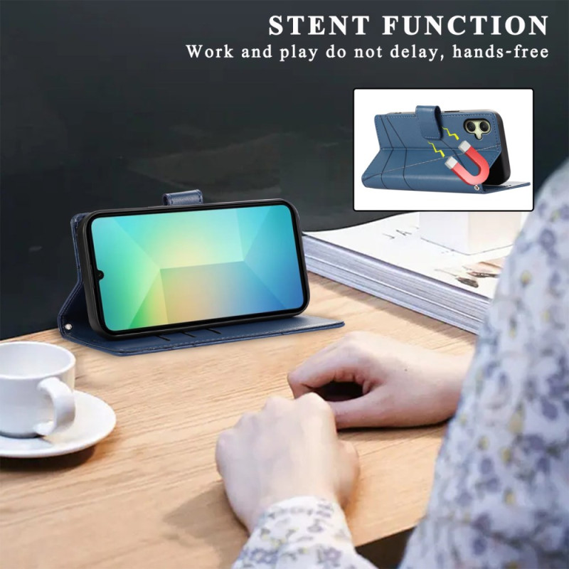 Proteggete il tuo Samsung Galaxy A07 5G / 4G con stile grazie a questa cover multifunzione. Caratterizzata da un design raffinato con stampe lineari, unisce una protezione ottimale alla praticità grazie agli scomparti per le carte e al laccetto per la mano.