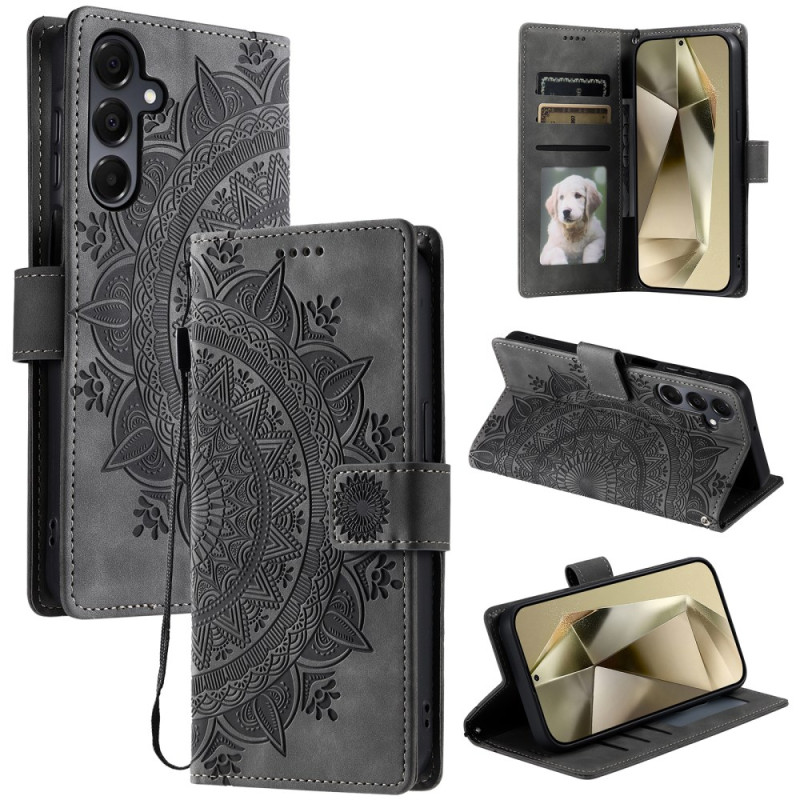 Étui portefeuille élégant pour Samsung Galaxy A37 5G avec motif mandala imprimé. Comprend 3 emplacements pour cartes, un compartiment pour billets, une dragonne pratique et une fonction support. Protection complète contre les rayures et l'usure quotidienne.