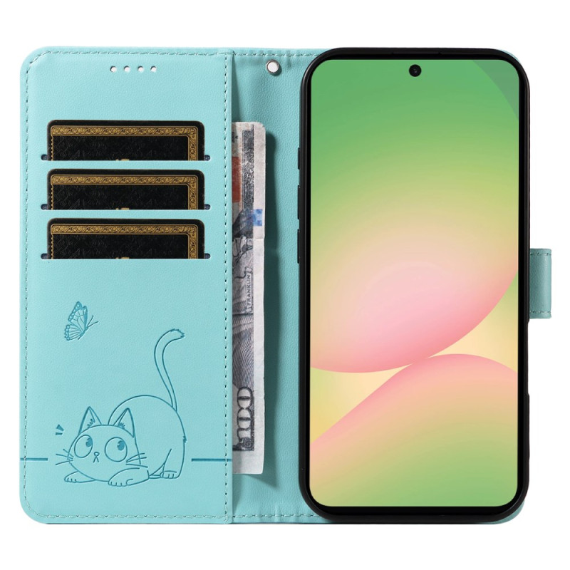 Étui portefeuille élégant pour Samsung Galaxy A57 5G avec motif chat porte-bonheur embossé. Design multifonctionnel avec 3 emplacements pour cartes, poche pour espèces et dragonne pratique. Fermeture magnétique sécurisée et protection intégrale.