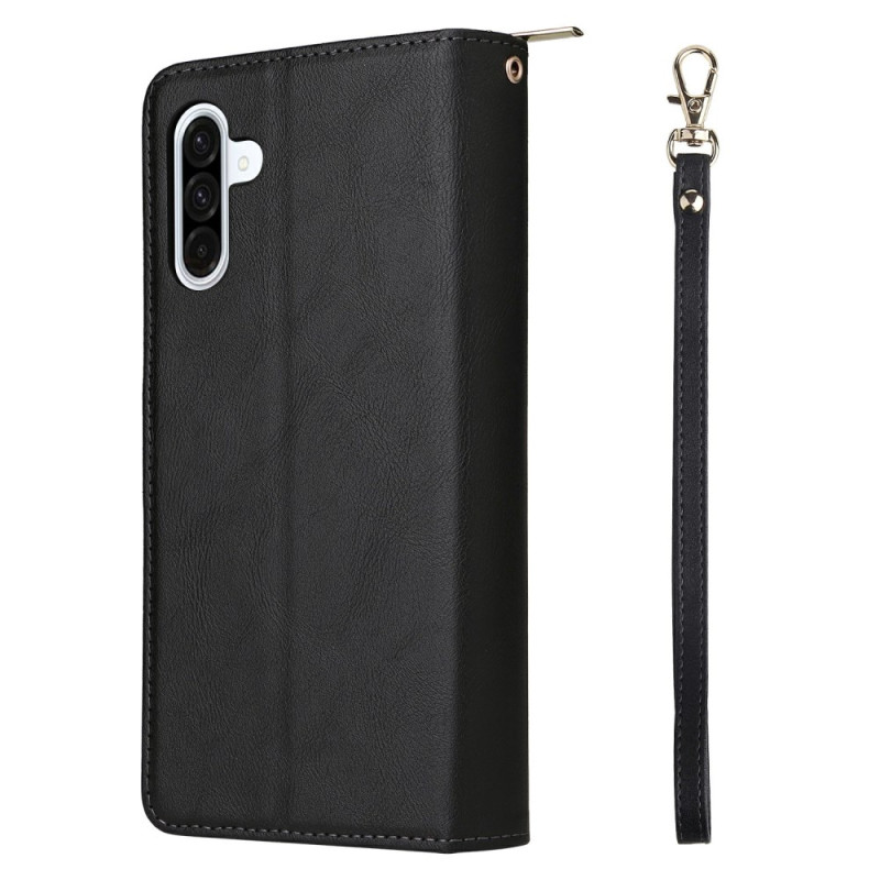 Custodia multifunzione in pelle PU per Samsung Galaxy A57 5G. Dispone di 9 scomparti per carte di credito, una tasca con cerniera per i contanti e una pratica cinghia per la mano. Chiusura magnetica sicura e supporto integrato per l'utilizzo a mani libere.
