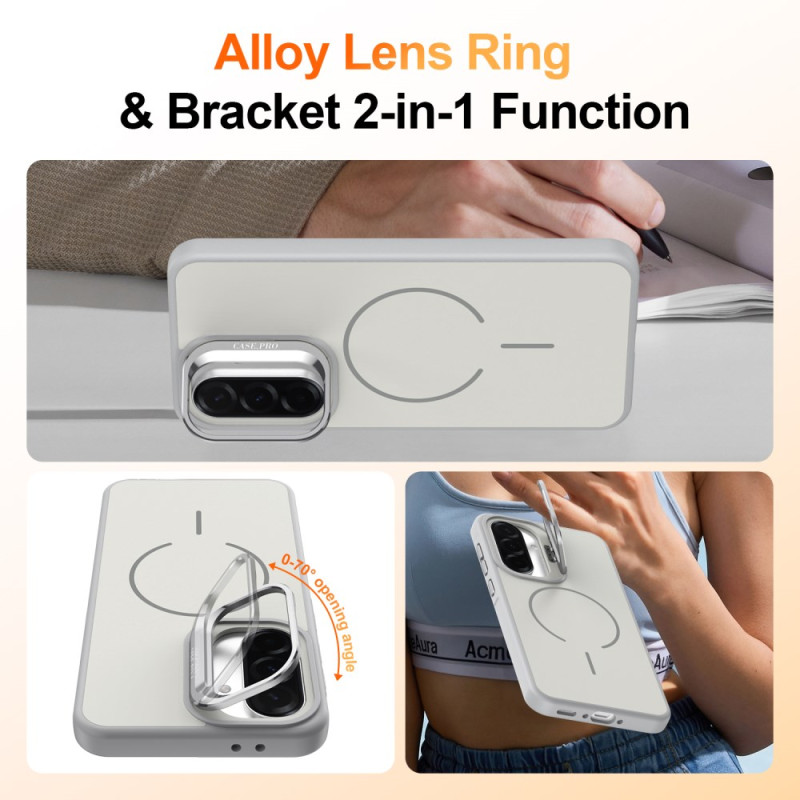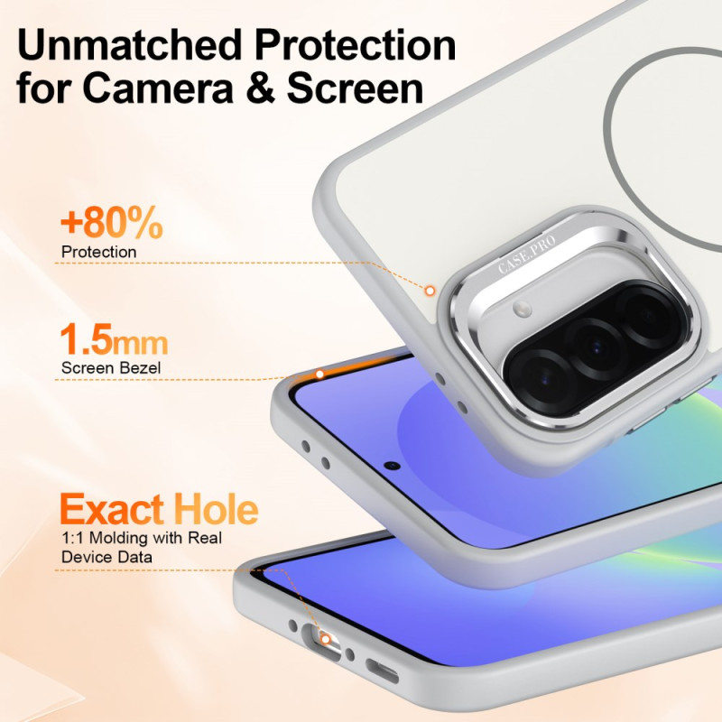 Protezione completa per il tuo Samsung Galaxy A57 5G. Guscio ibrido in PC + TPU con anello magnetico integrato, cavalletto pieghevole e cornice protettiva per l'obiettivo. Design resistente agli urti con angoli rinforzati e accesso completo alle funzioni.
