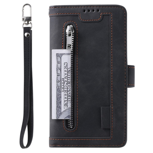 Custodia multifunzione in pelle PU per Samsung Galaxy S26 5G. Con 9 scomparti per carte, tasca sicura con cerniera e pratico laccetto. Design mani libere e chiusura magnetica per una protezione ottimale.