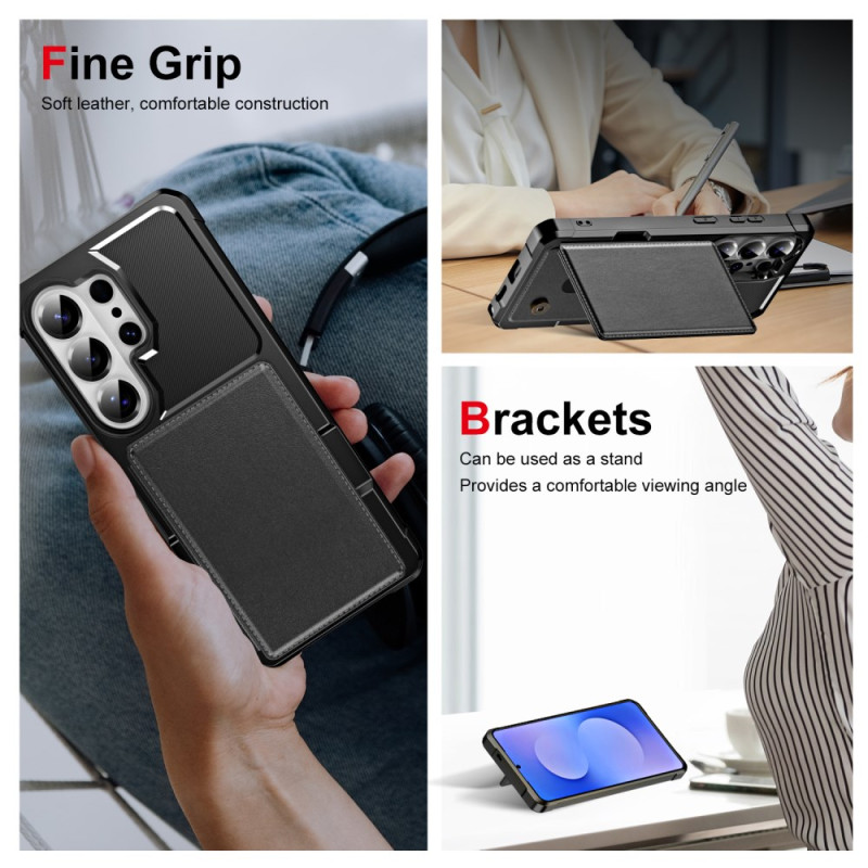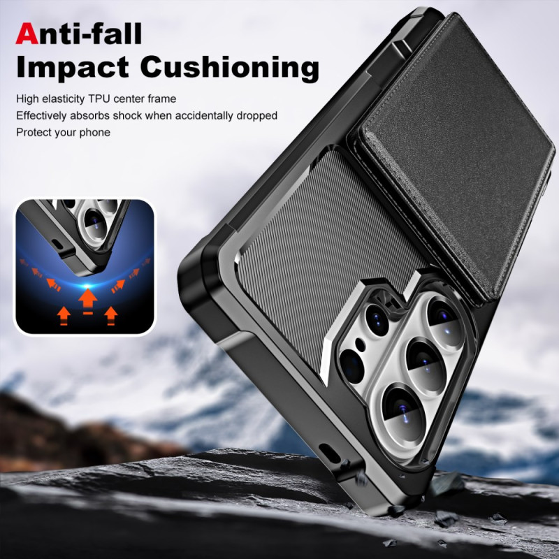 Protégez votre Samsung Galaxy S26 Ultra avec style grâce à cet étui multifonction en cuir et TPU. Doté d'un porte-cartes intégré pouvant accueillir jusqu'à 4 cartes, d'un support pliable pour visionnage mains libres et de coins renforcés pour une protection optimale contre les chocs.