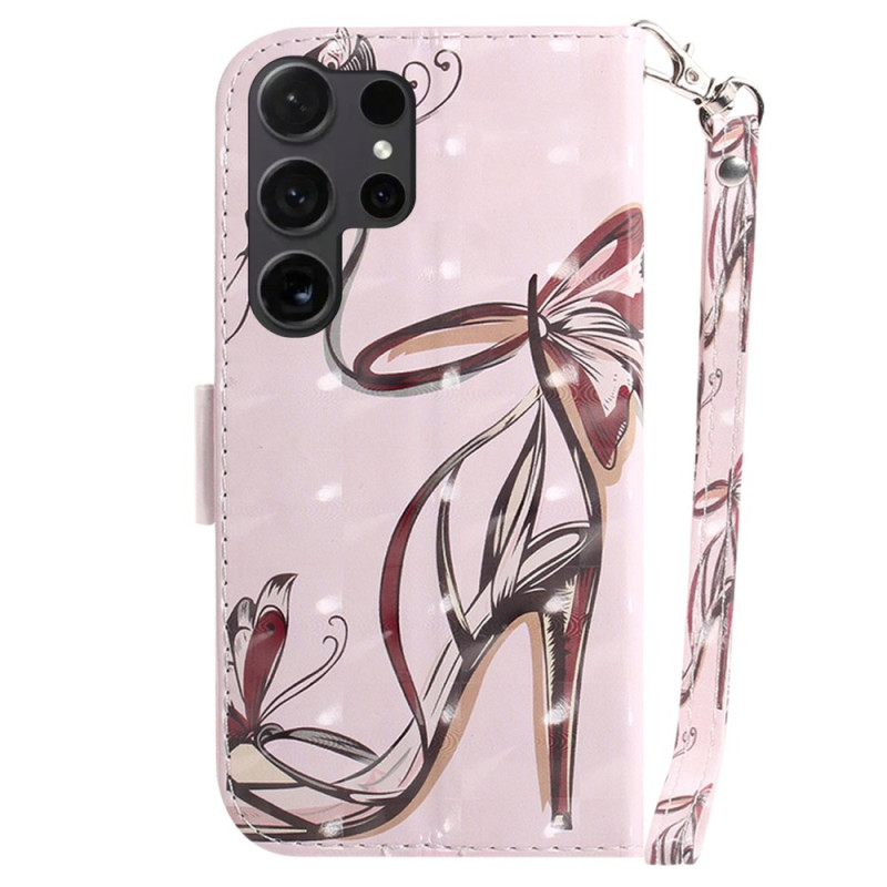 Étui portefeuille élégant en simili cuir pour Samsung Galaxy S26 Ultra. Design raffiné avec motif papillon et talons hauts. Comprend des emplacements pour cartes, un support pliable et une dragonne pratique. Protection complète avec fermeture magnétique sécurisée.