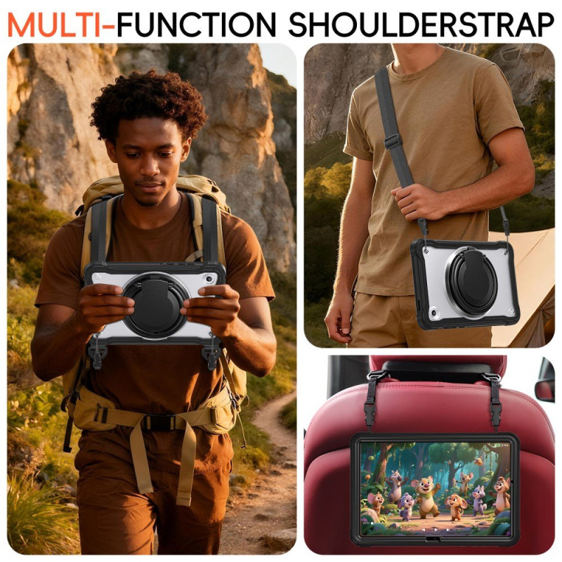 Rotazione a 360°, supporto integrato e tracolla regolabile per la massima mobilità.