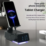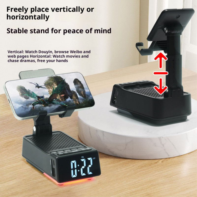 La sapiente convergenza di illuminazione, gestione del tempo e intrattenimento audio definisce questo dispositivo multifunzionale. Questa stazione 4-in-1 incorpora un altoparlante Bluetooth 5.1 per un suono ricco a 360° e un orologio digitale con doppia sveglia. Il supporto è regolabile a 180 gradi e consente una visione ergonomica in modalità verticale e orizzontale. L'illuminazione ambientale offre sette modalità dinamiche (gradiente, respirazione, colori fissi), creando un'atmosfera rilassante. La batteria integrata da 2000 mAh garantisce fino a 4 ore di riproduzione wireless continua.