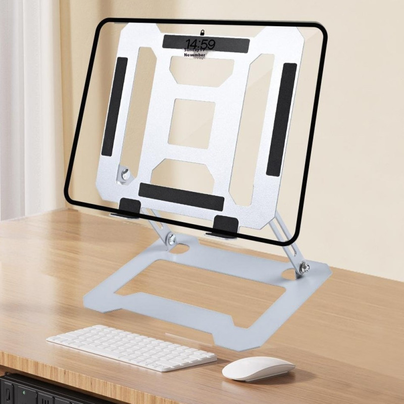Il supporto da tavolo pieghevole e regolabile offre un'ergonomia perfetta per migliorare il comfort di lavoro. Grazie al suo sistema di regolazione continua, posiziona il computer portatile all'altezza e all'angolazione ideali. Il suo design perforato assicura una circolazione ottimale dell'aria, limitando il surriscaldamento durante l'uso prolungato. Realizzato in robusto acciaio al carbonio con piedini in silicone antiscivolo, garantisce stabilità senza oscillare, sostenendo fino a 5 kg. Pieghevole e facile da trasportare, si adatta a un'ampia gamma di dispositivi fino a 17,3".