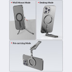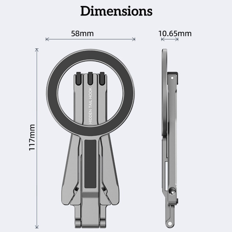 Questo supporto magnetico è un treppiede pieghevole progettato per offrire un'esperienza mani libere versatile e ultra-pratica. Compatibile con gli iPhone da 12 a 16 grazie all'adesione magnetica diretta o ai cover MagSafe, può ospitare anche altri smartphone grazie all'anello magnetico in dotazione. Realizzato in lega di alluminio resistente e leggera, è dotato di potenti magneti in alluminio-ferro-boron per una presa sicura. Compatto quando è ripiegato (117 × 58 × 10,65 mm) e con un peso di soli 60 g, può essere utilizzato come treppiede, supporto da tavolo o supporto inclinabile, a seconda delle esigenze.