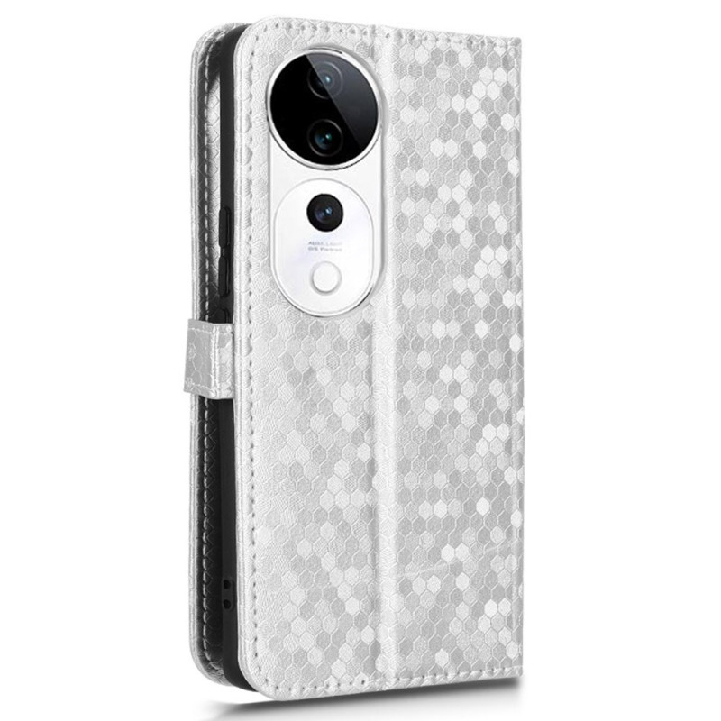 Elegante cover a portafoglio in pelle PU con motivo a pois in rilievo. Funzione stand regolabile per una visione ottimale a mani libere. Tasche integrate per carte e banconote. Pratica tracolla inclusa per un trasporto sicuro.