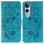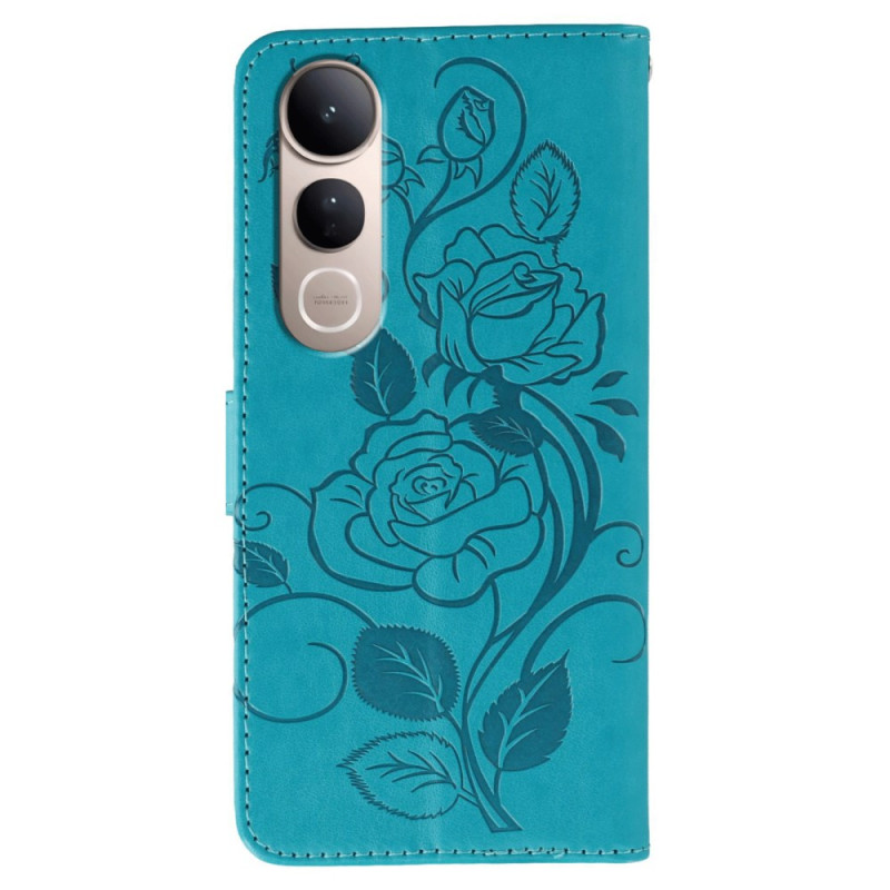 a portafoglio in pelle PU per Vivo V50 Lite 4G/5G con farfalle e rose stampate. Dispone di 3 scomparti per carte di credito, uno scomparto laterale e una funzione stand per un'esperienza mani libere