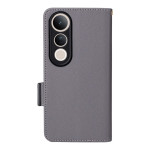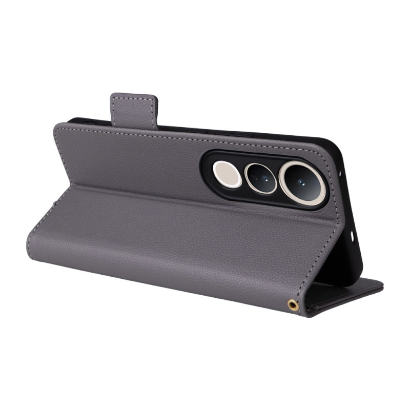 Elegante cover a portafoglio in pelle PU testurizzata per Vivo V50 Lite 4G/5G. Dispone di slot per carte, supporto per mani libere e chiusura magnetica sicura. Viene fornita con un pratico laccetto per facilitare il trasporto.