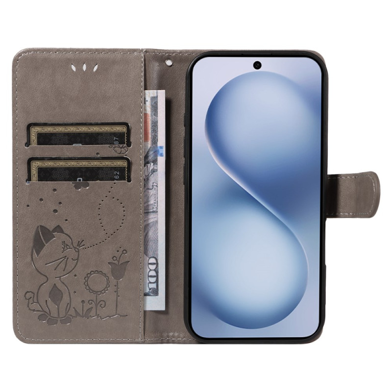 Proteggete il tuo smartphone con stile grazie a questa cover a portafoglio in pelle PU di prima qualità. Il suo design raffinato con il motivo di un gatto e di un'ape combina stile e funzionalità, con slot per carte, un supporto integrato e un pratico laccetto.