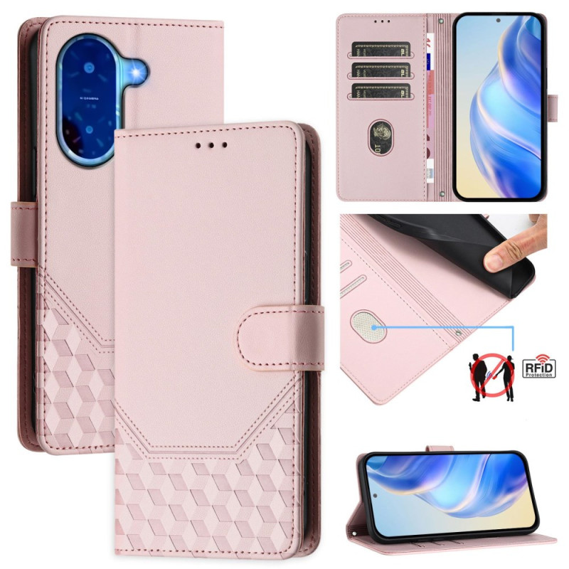 Custodia in pelle con blocco RFID, funzione portafoglio e supporto vivavoce. Realizzata in pelle PU di alta qualità con motivo fantasia nido d'ape