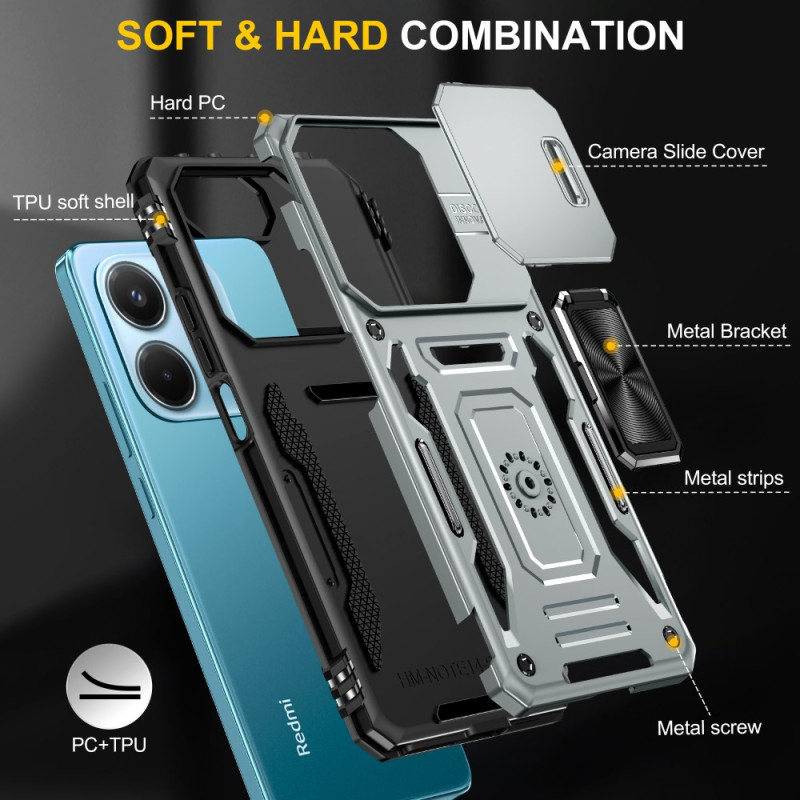 Scoprite la nostra cover protettiva avanzata per Xiaomi Redmi Note 14. Dotata di un supporto regolabile, di una protezione scorrevole per le lenti e di un robusto design in PC + TPU, offre la massima protezione contro urti e cadute.