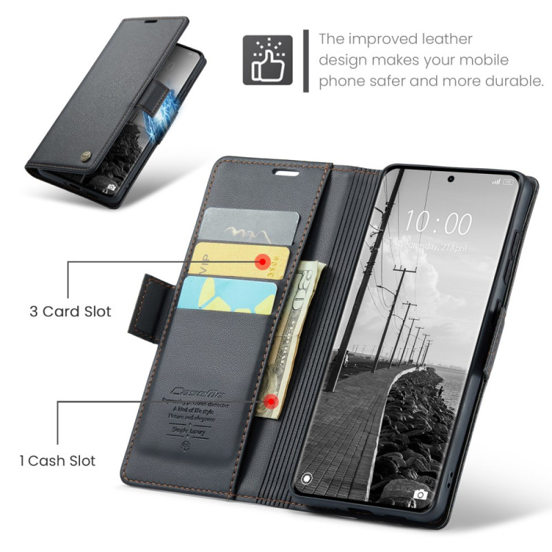 Scoprite la cover a portafoglio CASEME che unisce eleganza e praticità. Grazie all'avanzata protezione RFID, ai 3 scomparti per carte e al supporto regolabile, questa cover in pelle testurizzata offre una protezione completa per il tuo smartphone e semplifica la tua vita quotidiana.