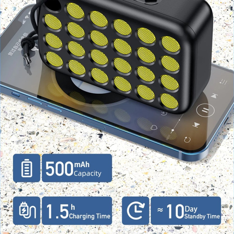 The AWEI Y385 compact speaker offers a stable and fluid Bluetooth 5.0 connection, suitable for both smartphones and computers. Its TWS function lets you combine two units to create a true stereo effect and enhance the feeling of immersion. Thanks to its built-in microphone, the device can handle hands-free calls with complete clarity. Its lightweight design with strap makes it easy to carry, and attaches easily to handlebars, making it ideal for cycling or travelling. Integrated lighting adds a visual dimension to listening, while the 500 mAh battery provides up to seven hours of use, depending on volume.