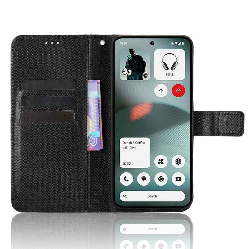 Protect your Nothing Phone (3a) Lite 5G in style with this diamond-textured PU leather wallet case. Featuring card slots, a note pocket, a foldable stand and a practical wrist strap for optimum everyday use.