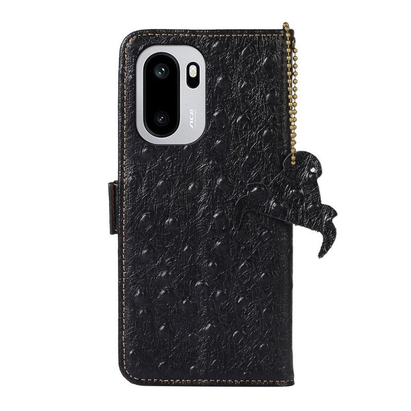 Refined ostrich texture, 2 card slots, 1 photo pocket and adjustable viewing stand.