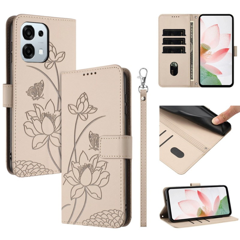 Stylish wallet case with printed lotus motif for your Oppo A6 Pro 5G / 4G. Combines premium protection, wallet functionality with card slots, foldable stand for hands-free viewing and detachable hand strap.